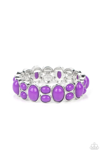 Encased in shiny silver frames, stacks of purple oval beads alternate with oversized purple ovals along stretchy bands around the wrist for a posh pop of color.