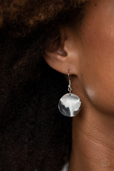 Featuring a galactic tie dye print, flat colorful discs swirled in tones of pink and yellow combine with curved silver discs, swinging from the bottom of a bulky silver chain for a trendy throwback look. Features an adjustable clasp closure.