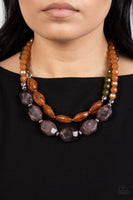 Faceted strands of cloudy brown and Olive Branch crystal-like beads give way to a colorful assortment of oversized brown and smoky black crystal-like accents. Shiny silver beads adorn the hearty layers, adding a dash of metallic glitz to the tropical inspired display. Features an adjustable clasp closure.
