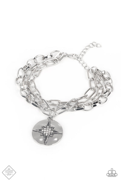 An antiqued silver star, embellished with sparkling dainty white rhinestones, is embossed over a subtly hammered silver disc. The celestial medallion swings from a collection of three oversized silver chains, creating layers of movement around the wrist. Features an adjustable clasp closure.