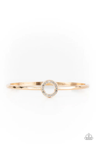 Brilliant dainty white rhinestones set in a shiny gold round frame, create a glitzy circle in the center of a subtly hammered gold bangle.