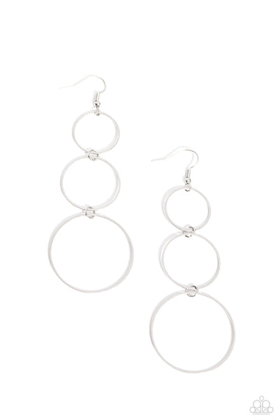 Three flat silver hoops gradually increase in size as they link from the ear, creating a dizzyingly lure. Earring attaches to a standard fishhook fitting.