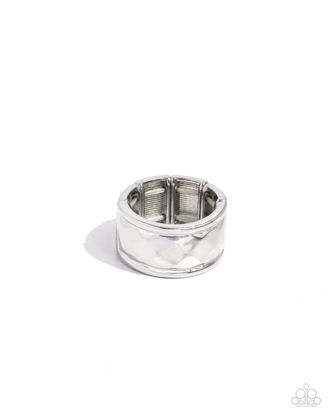 A faceted diamond-shaped pattern races across the center of a thick silver band for a tactile look. Features a stretchy band for a flexible fit.