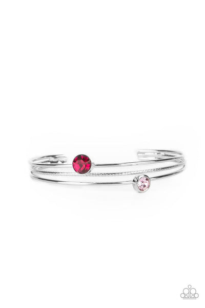 A pair of Pale Rosette and Fuchsia Fedora rhinestones sporadically adorn a layered silver cuff, creating a dainty dazzle around the wrist.